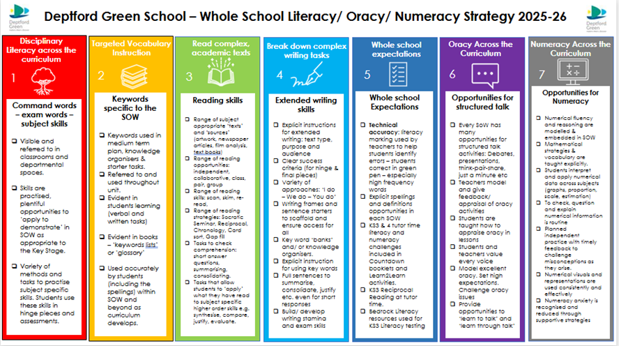 When curriculum is planned, literacy and numeracy skills are embedded in schemes of work and lesson resources.  Below are the Deptford Green Literacy pillars.  We have adapted our strategy from the EEF for Literacy and Numeracy. Our Oracy strategy is taken from the Voice 21 principles.   The implementation of these strategies is monitored throughout the year by various members of the Teaching and Learning team, and regular training related to these elements takes place across the year as part of teachers’ professional development.  Additional Literacy and Numeracy intervention is provided for students who are working significantly below their age-related expectations. We use the Bedrock Literacy Programme for Key Stage 3, focussing on building vocabulary and reading proficiency.  At Key Stage 4, small group intervention focussing on speed reading for GCSE access is the priority.