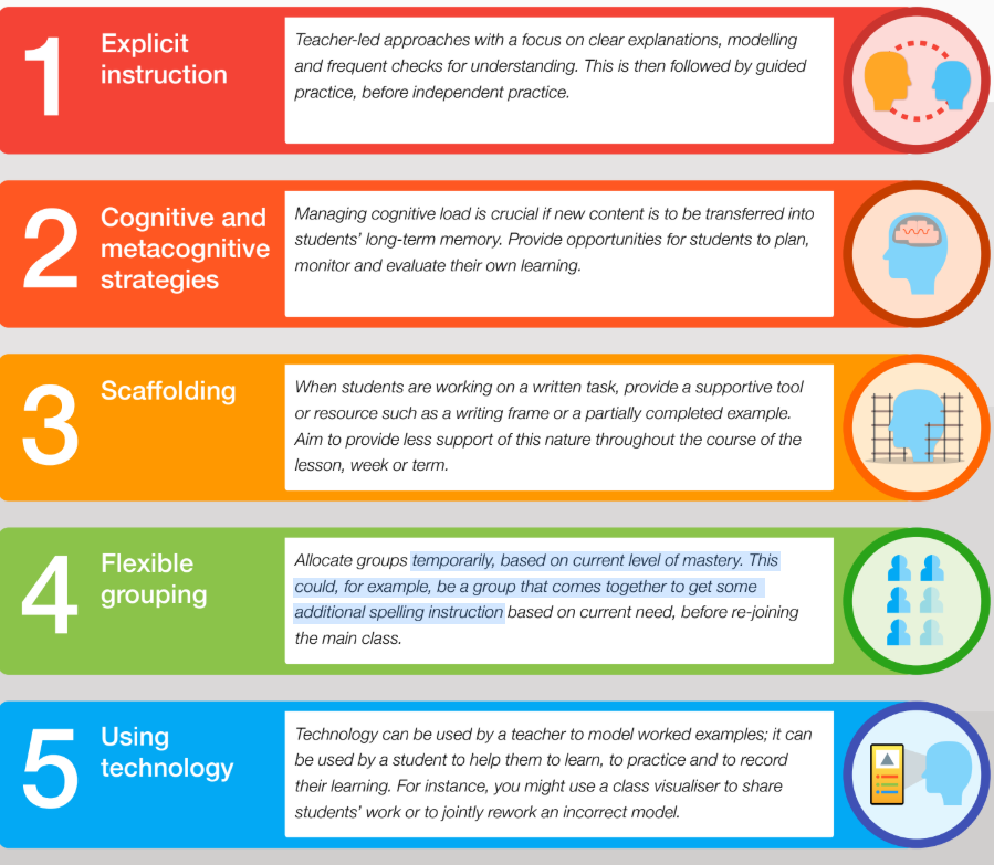 THE WHY: ‘For students to reach the point where they can apply their learning with a level of fluency requires an element of often extensive practice’ (Sherrington). Across a series of lessons, opportunities for extensive practice is provided.  During this time, the teacher will give feedback to individuals and address misconceptions. Gradual reduction of scaffolding will take place over time to develop full independence.